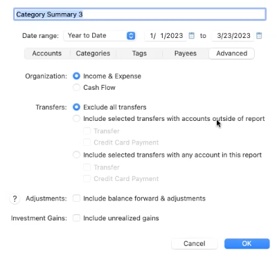 You can organize your report by Income & Expense or Cash Flow (inflows and outflows). If the text is grayed out, then the option is unavailable.