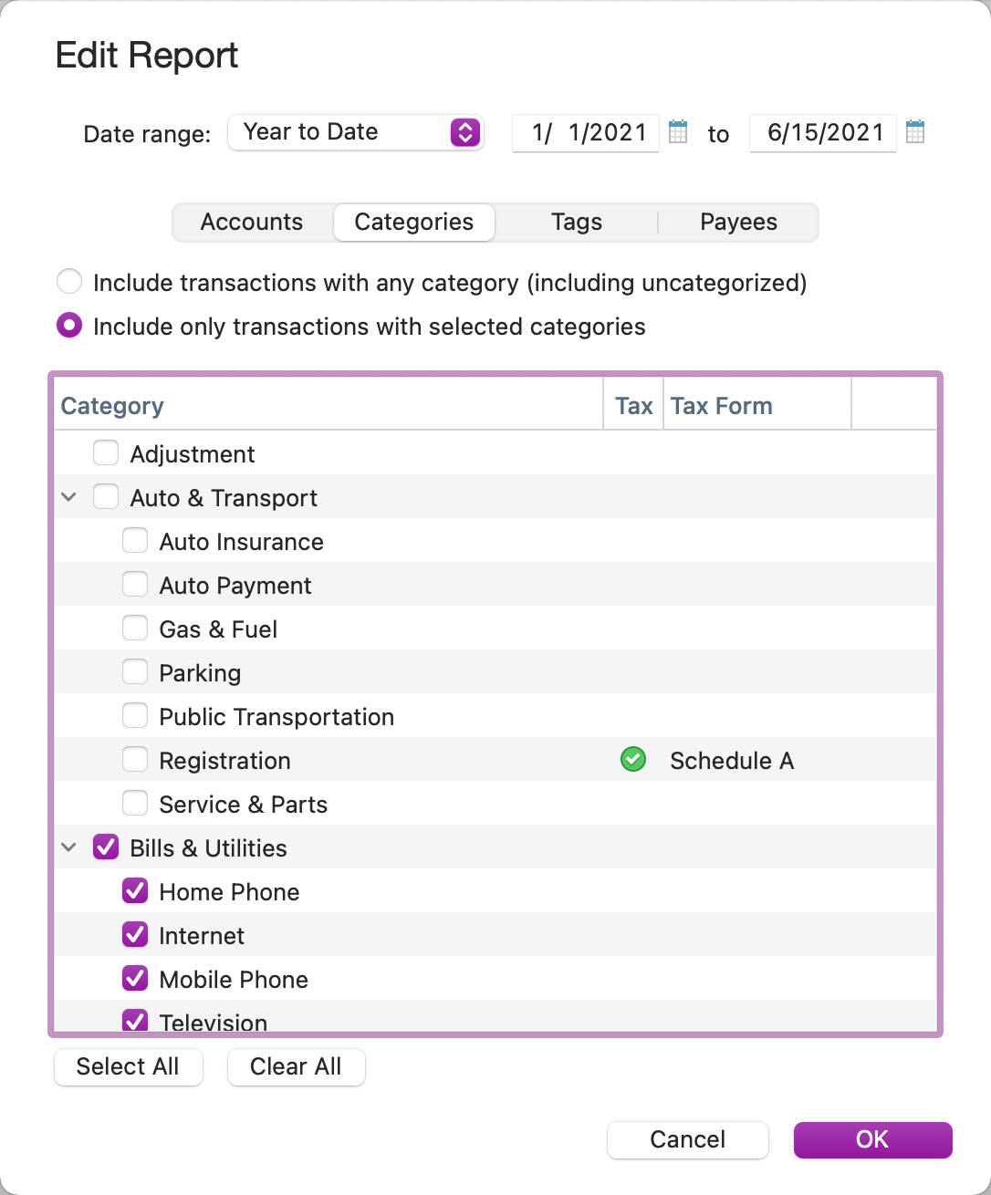 If you choose to Include only transactions with selected categories, then use the checkboxes to add or remove categories from your report.