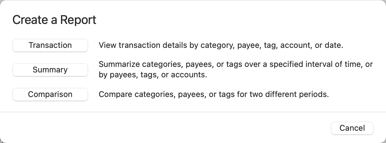You can also create a new report by choosing one of the following options from the Reports Menu: