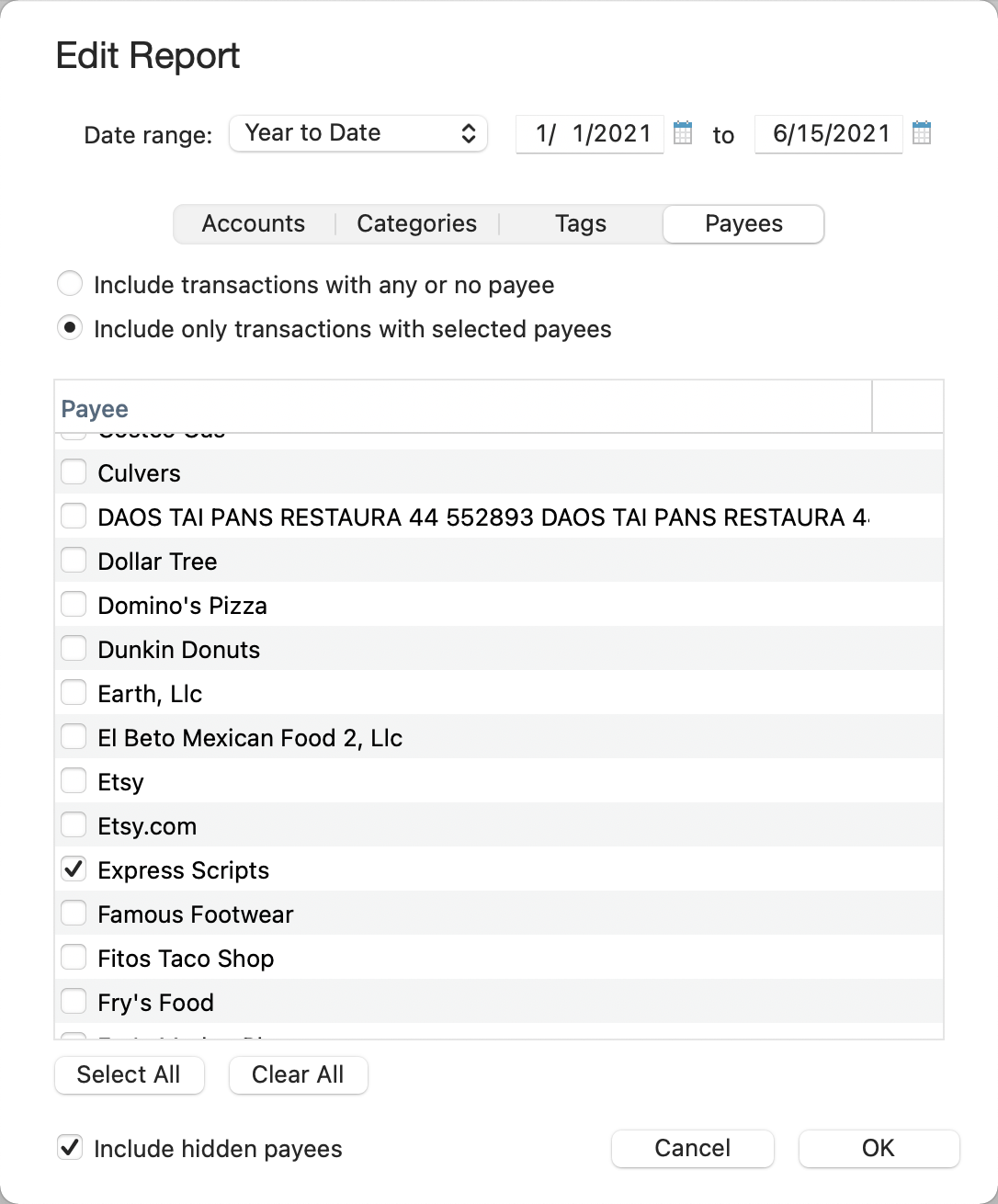 If you choose to Include only transactions with selected payees, then use the checkboxes to add or remove payees from your report.