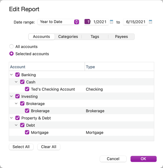 Under Accounts, you can choose either All Accounts or Selected Accounts. Under Selected Accounts, use the checkboxes to add or remove accounts from your report.
