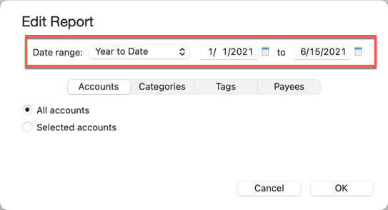 The Edit Report screen will appear. Depending on the report criteria, not all of the edit options may be available for an individual report, but the five standard options are Date Range, Accounts, Categories, Tags, Payees.