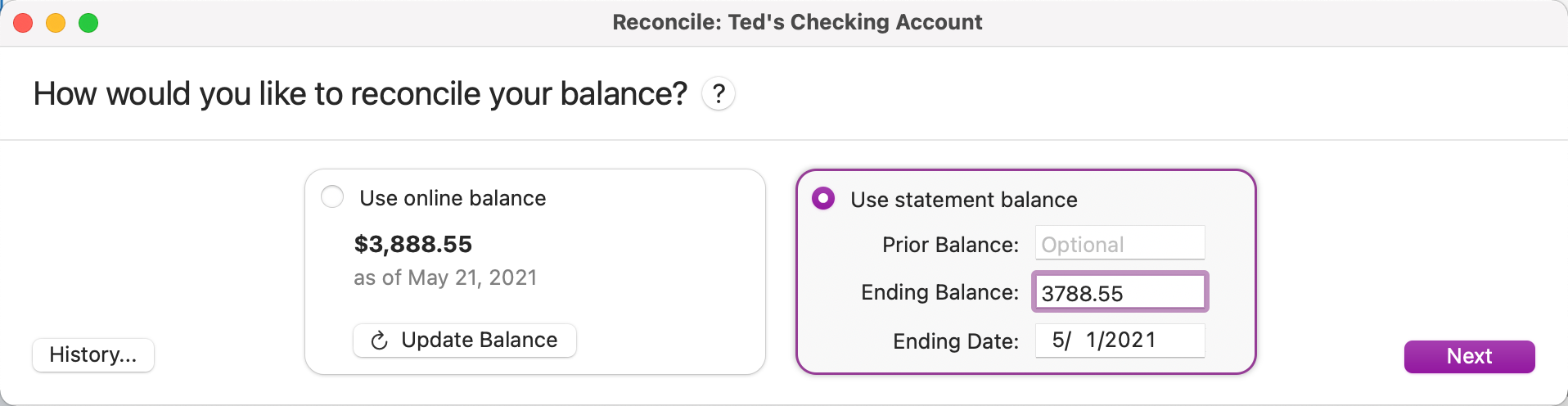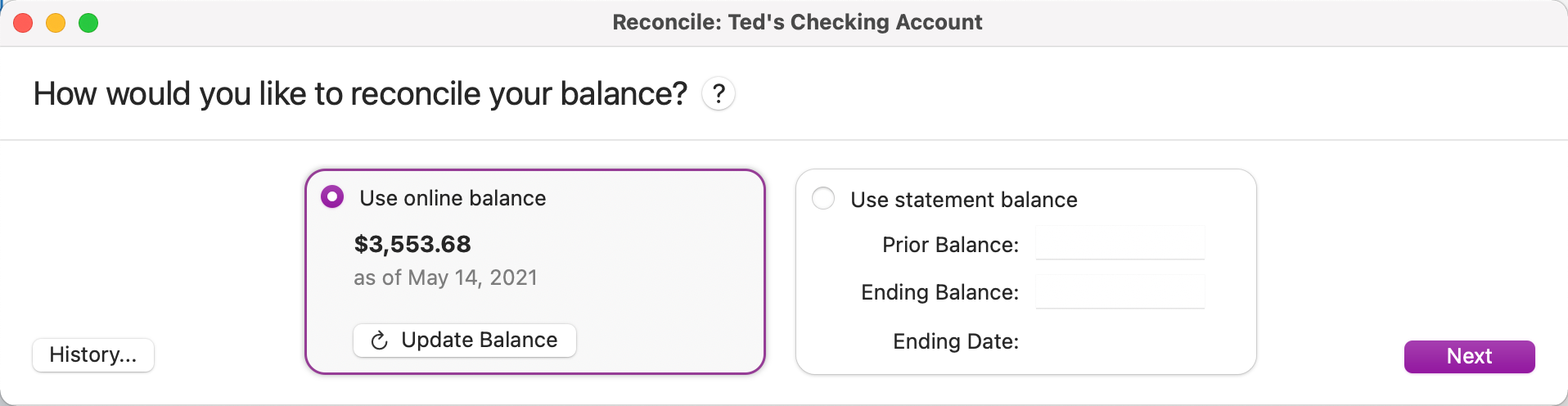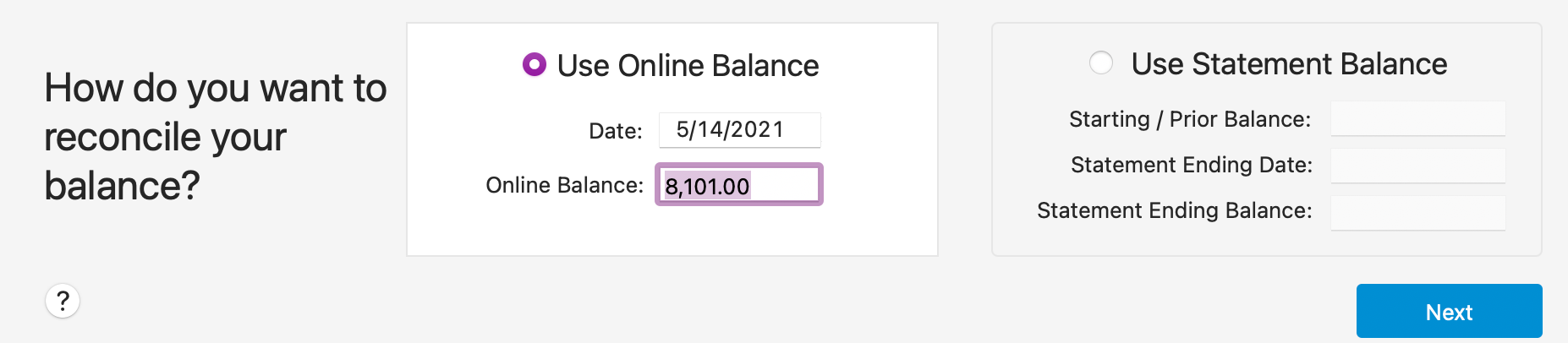Choose whether to reconcile against an online balance or a statement balance.