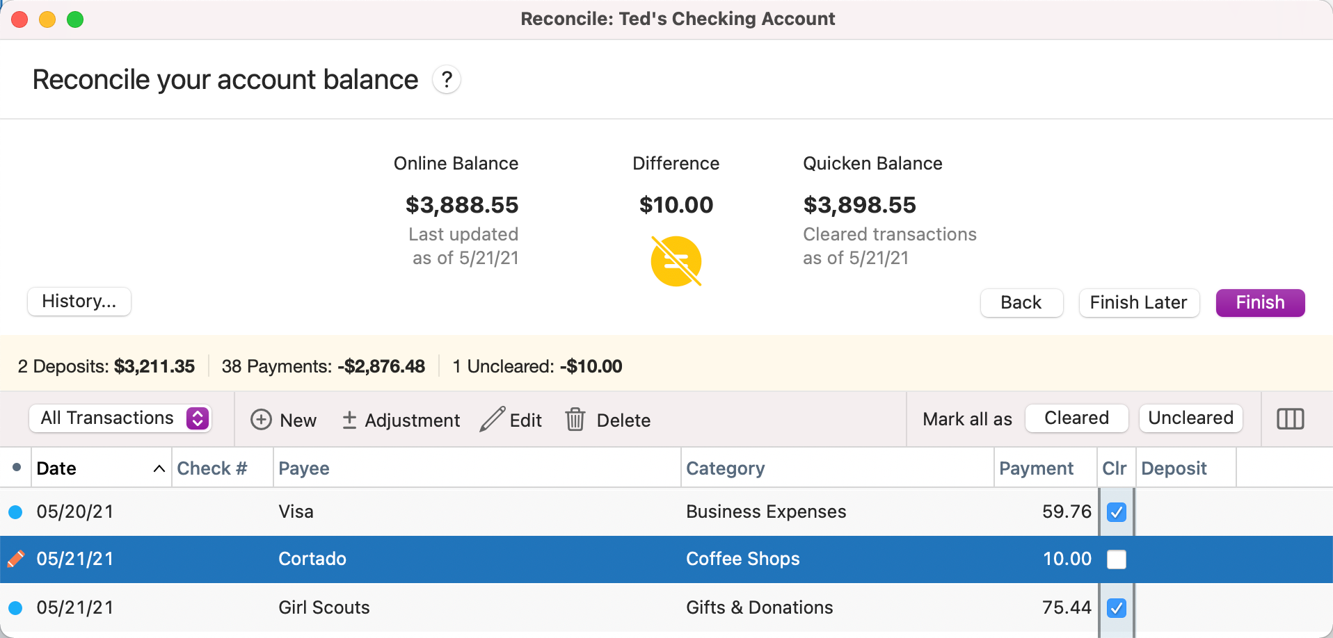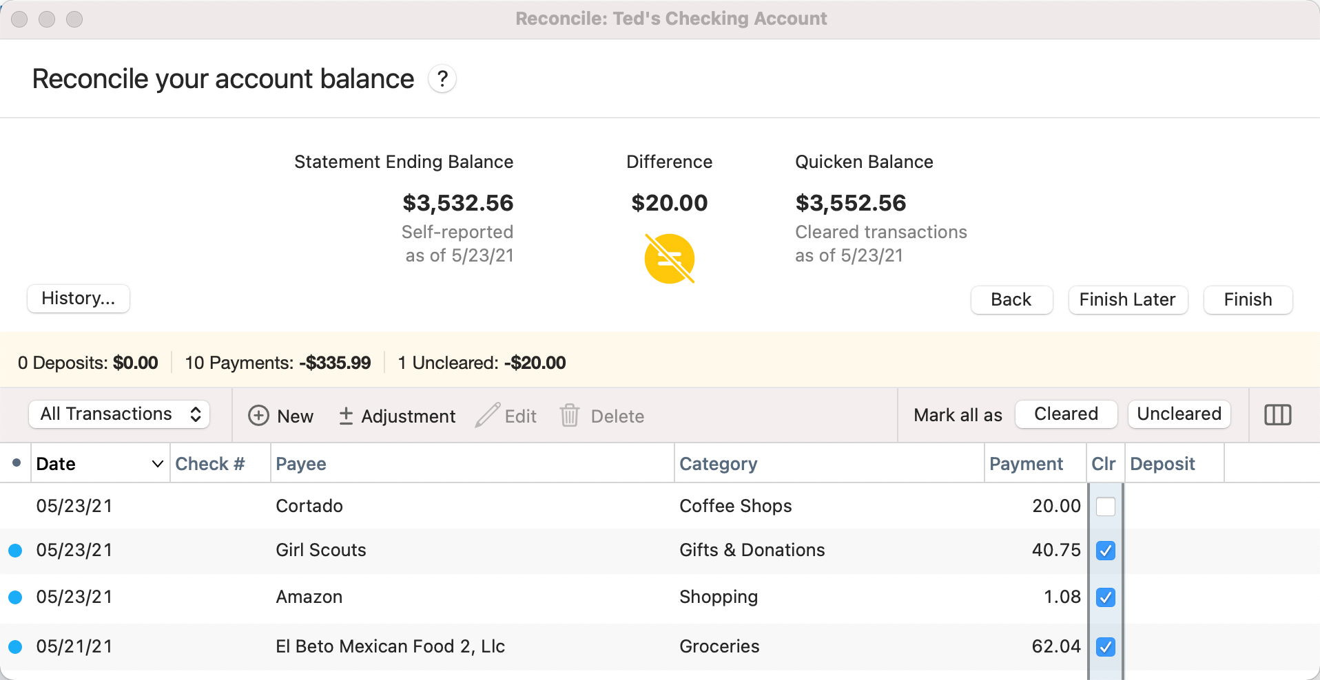 If you select Finish and your account is not reconciled, you will be prompted to either Finish Later or Add Adjustment. If you select Add Adjustment tan adjustment transaction with a payee of Reconcile Adjustment will be added with an amount that will bring your register difference to 0 (zero).