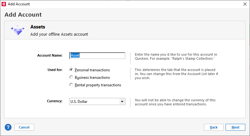 Set up a new account in Quicken (You will be guided through the account setup process).