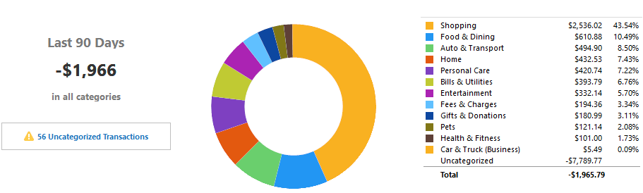 Use the Spending tab to see a breakdown of where your money is going. The pie chart provides a way to drill down and see the transactions in a particular category. You can also see which transactions are uncategorized, so you can easily assign them to categories.