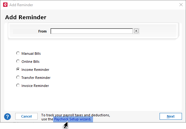 - At the bottom of the Add Reminder screen, select Paycheck Setup Wizard.